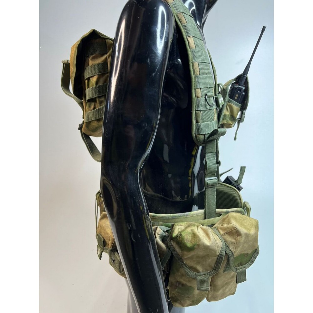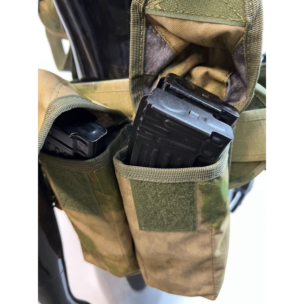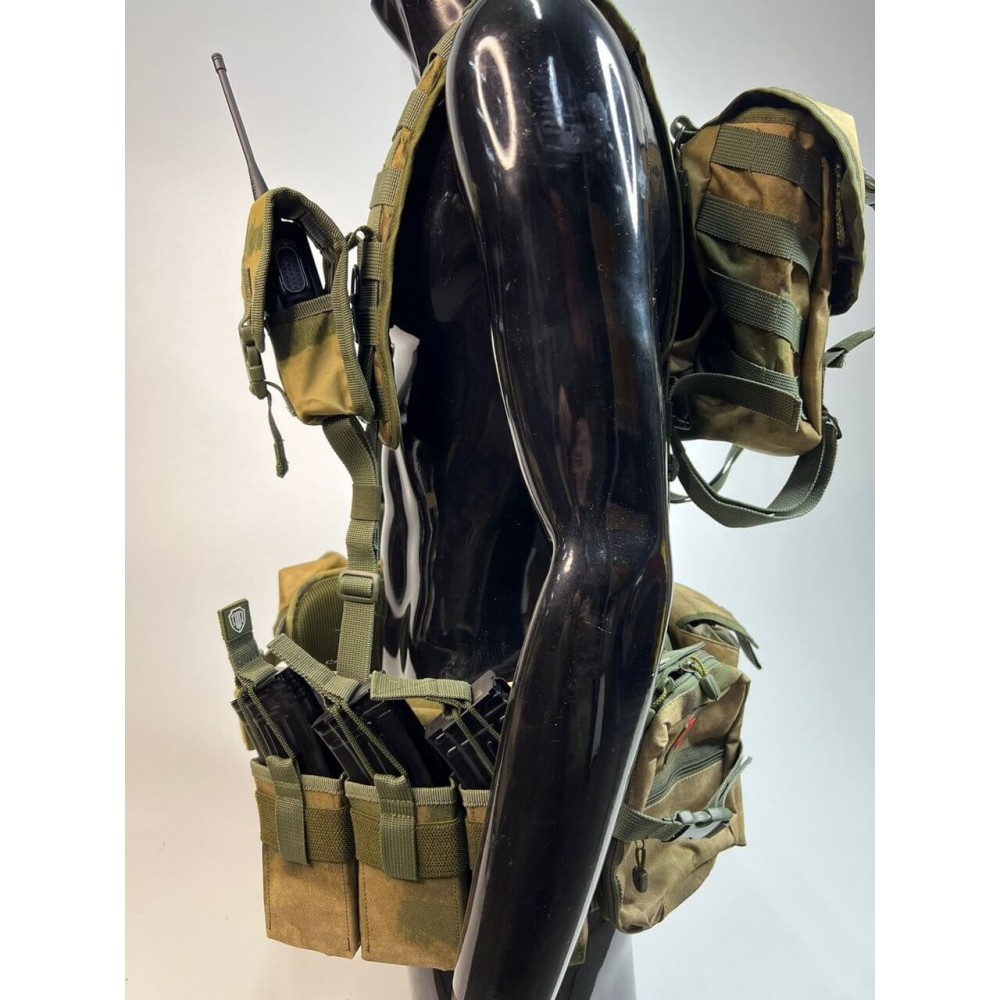 - Множество карманов: В нижней части системы расположены 5 карманов под магазины АК - три одиночных открытых и два сдвоенных закрытых (по два магазина в каждом). Также есть подсумки для гранат, рации, сброса рожков/магазинов, а также сухарный подсумок на спине.