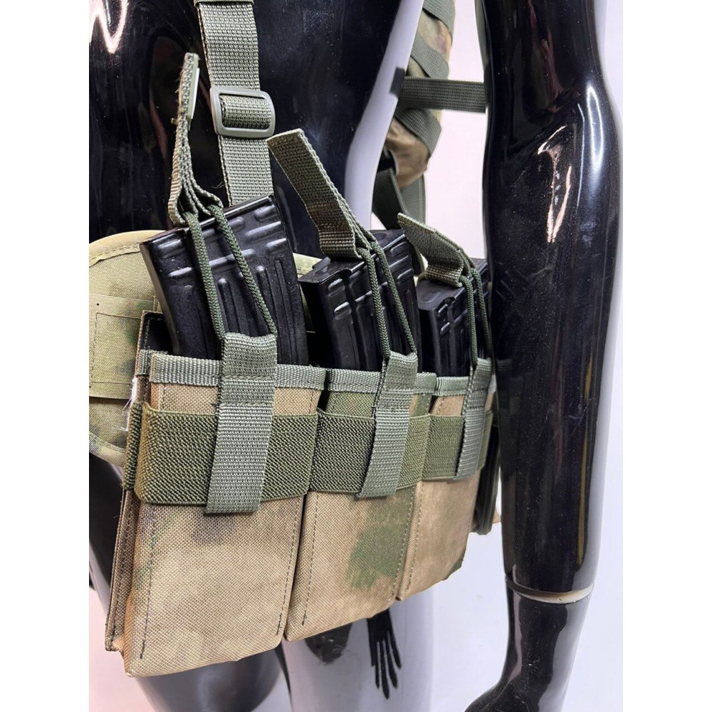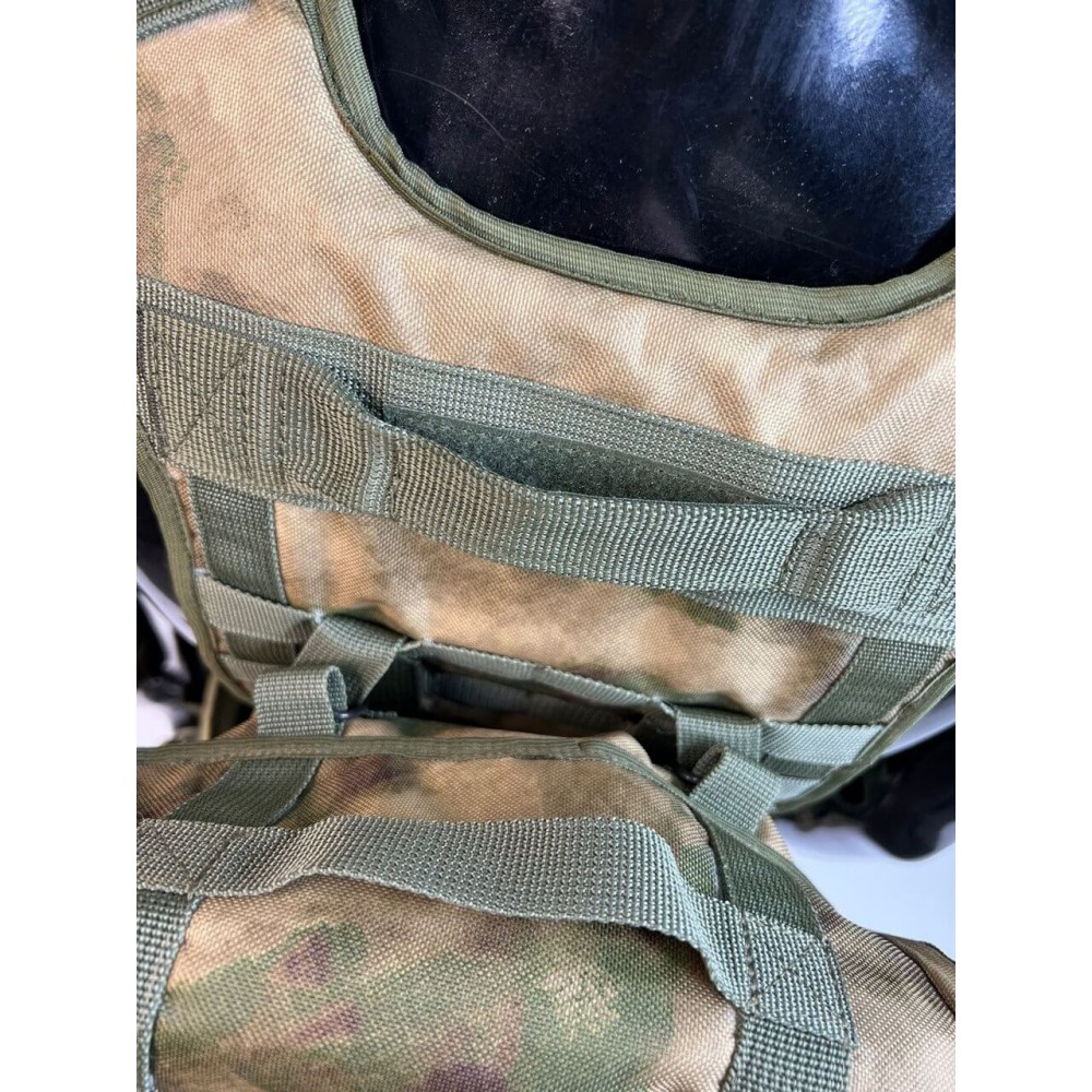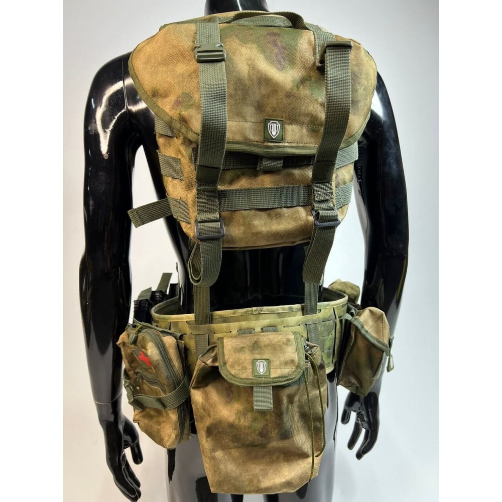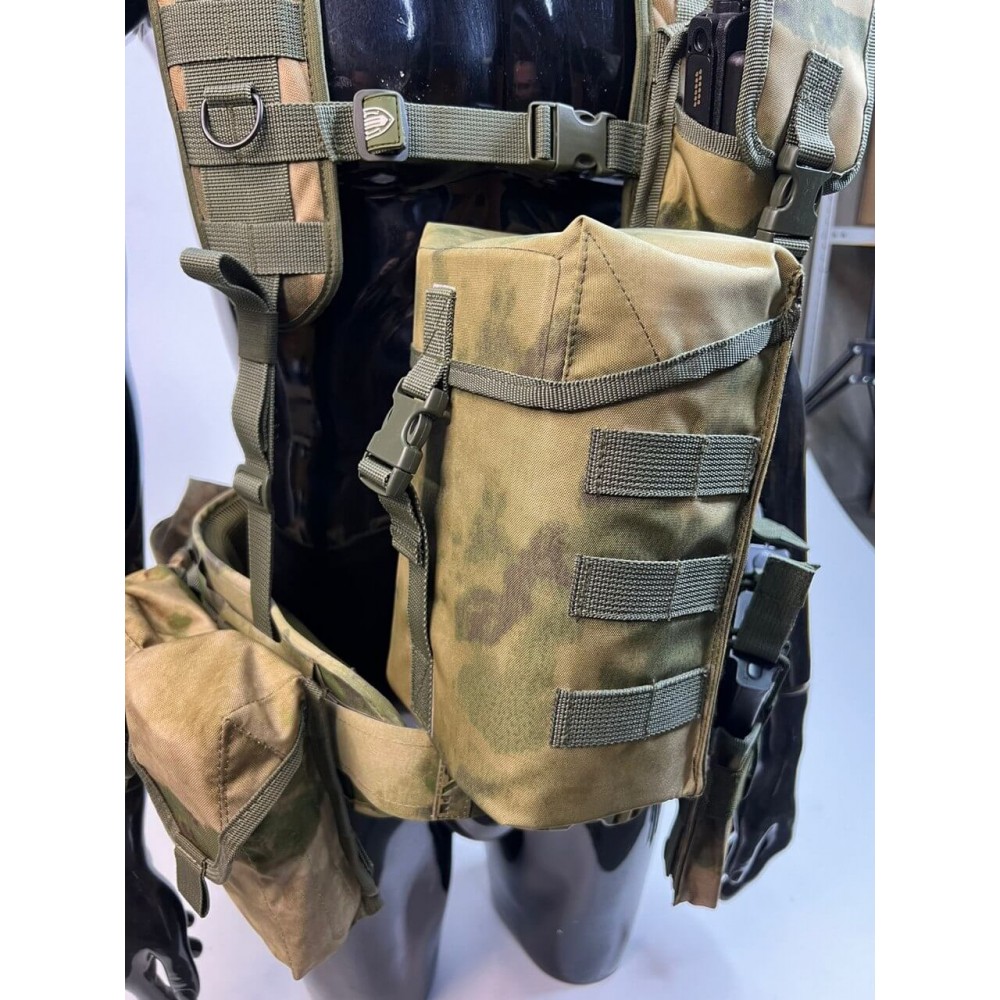 - Множество карманов: В нижней части системы расположены 5 карманов под магазины АК - три одиночных открытых и два сдвоенных закрытых (по два магазина в каждом). Также есть подсумки для гранат, рации, сброса рожков/магазинов, а также сухарный подсумок на спине.